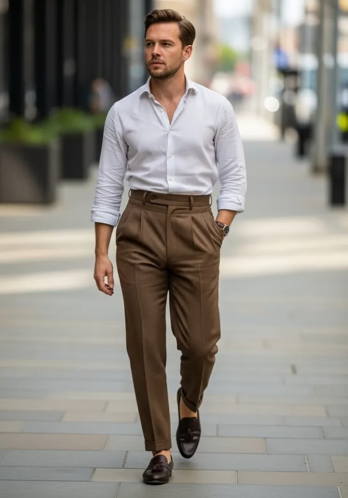 This look is classic with a modern twist. He is wearing high waisted brown pleated trousers that create a strong, elongated silhouette. The fabric looks smooth with a subtle sheen, and the slight cuff at the hem adds a tailored finish. On top, a clean white button down shirt with the sleeves casually rolled up keeps things fresh and relaxed. Dark brown tassel loafers bring polish and depth, tying the whole outfit together in a very refined way.