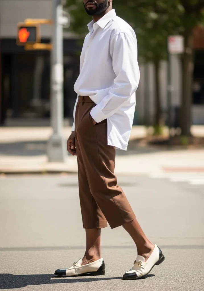 This outfit feels sharp and modern in the most effortless way. He is wearing tailored brown trousers with a cropped length that shows just a hint of ankle, giving the whole look a contemporary edge. The pants have clean pleats and a smooth structured fabric that holds its shape beautifully. On top, a slightly oversized white button down shirt adds contrast and freshness. The two tone loafers in cream and black bring personality and polish without feeling overdone. The overall vibe is sleek, confident, and quietly bold.