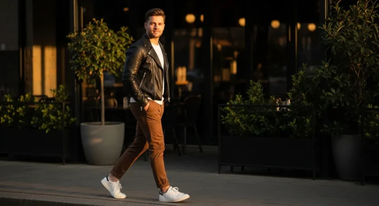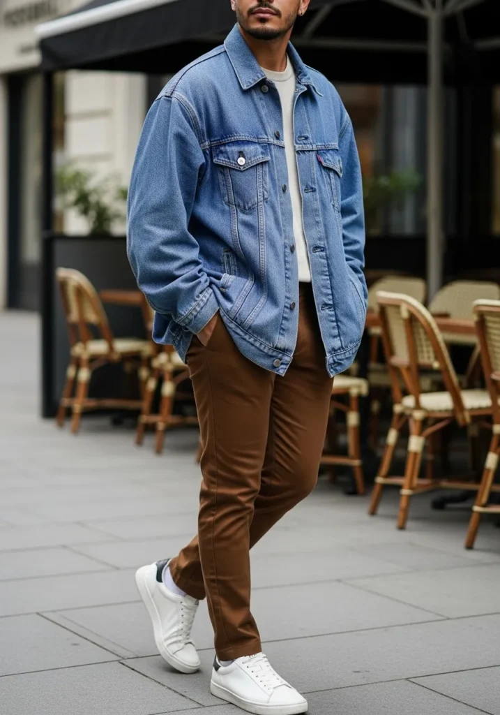 This outfit blends casual and polished in the best way. He is wearing slim tailored brown trousers with a clean, tapered fit that sharpens the whole look. On top, a soft neutral tee keeps things simple, while a classic blue denim jacket adds structure and that laid back cool factor. Crisp white leather sneakers finish it off, giving the outfit a fresh and modern feel that works perfectly for a city coffee run or weekend stroll.