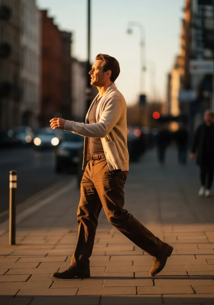 This look feels cozy but still very put together. He is wearing relaxed brown trousers with a straight cut that drapes nicely over dark suede boots. On top, a light beige cardigan adds softness and texture, layered over a fitted neutral tee. The mix of warm browns and creamy tones gives the whole outfit that golden hour glow, especially styled in natural evening light.