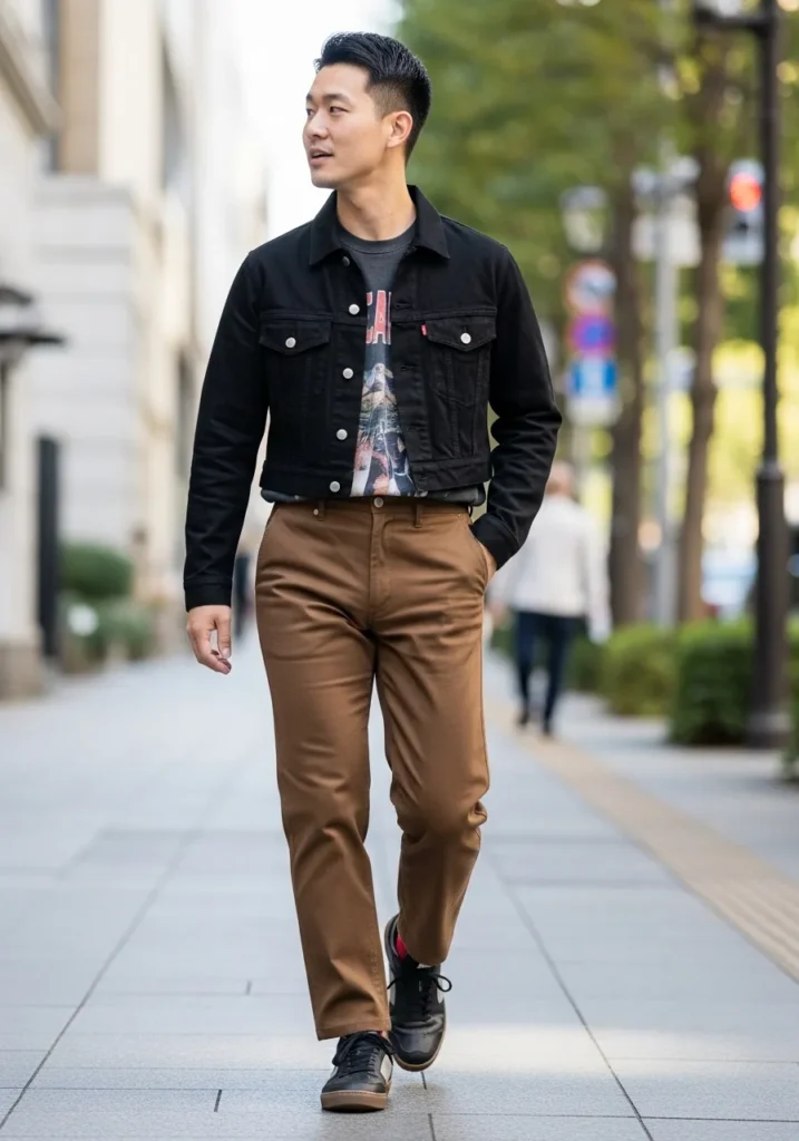 This outfit leans into that cool city vibe. He is wearing straight cut brown trousers with a clean tailored fit that keeps the look sharp. On top, a black denim jacket adds structure and edge, layered over a graphic tee that brings personality. Black low top sneakers ground the outfit and make it feel relaxed and wearable for everyday errands or weekend plans.