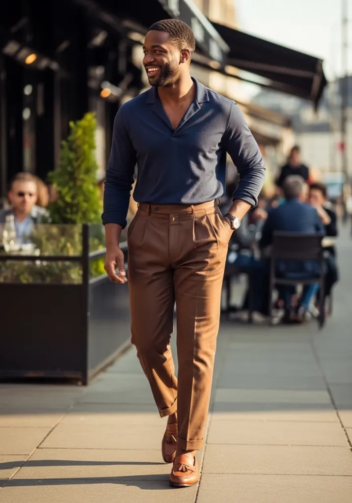 This outfit feels polished but still relaxed enough for a sunny afternoon out. He is wearing high waisted brown trousers with soft pleats and a slightly tapered leg that hits perfectly at the ankle. The fabric looks smooth and structured, giving that clean tailored shape. On top, a deep navy long sleeve polo adds richness and contrast, while brown tassel loafers echo the warm tone of the pants and pull everything together beautifully.
