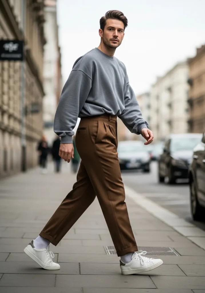 This look is such a cool mix of comfort and polish. He is wearing rich brown trousers with front pleats and a slightly cropped hem that shows just a hint of white socks. The fit is tailored through the leg but still relaxed enough to feel modern. On top, an oversized grey sweatshirt adds volume and softness, creating that effortless contrast between structured and cozy. Crisp white sneakers keep everything fresh and street ready.