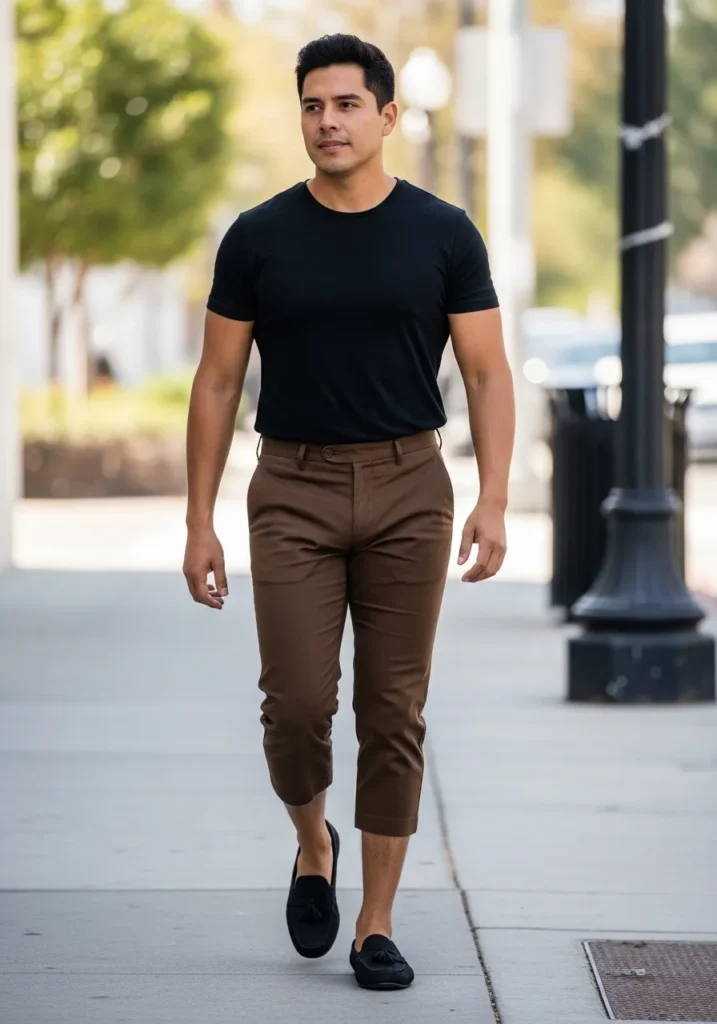 This look is all about clean lines and confidence. He is wearing slim brown trousers with a cropped length that shows a bit of ankle, giving the outfit a modern edge. The fabric looks smooth and slightly structured, which keeps the silhouette sharp. On top, a fitted black crew neck tee keeps things simple and streamlined. Black loafers finish the outfit with a sleek touch that feels polished but not overdone.