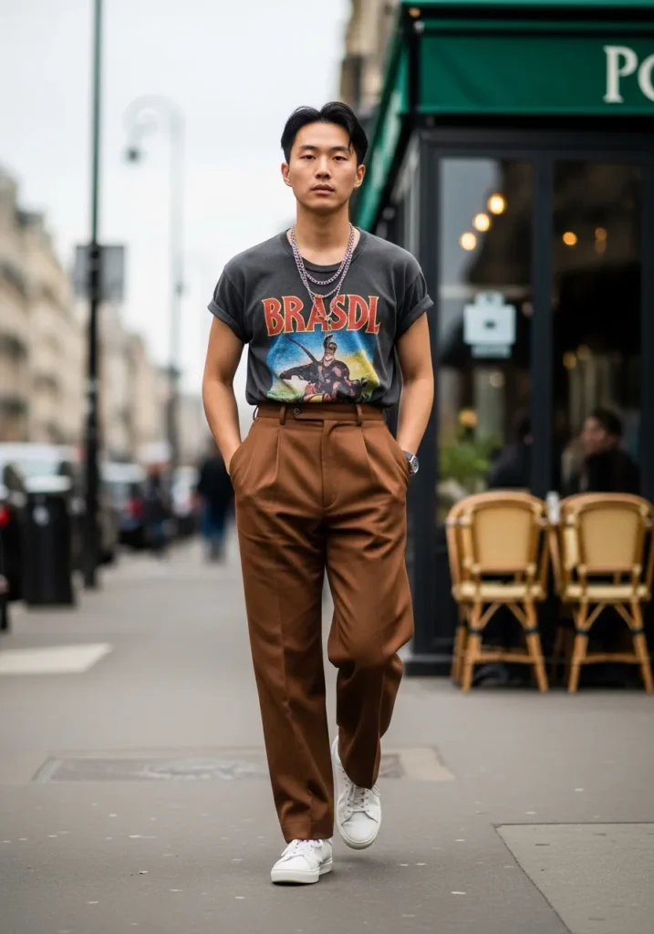 This look mixes tailoring with street style in the coolest way. He is wearing high waisted brown pleated trousers with a relaxed straight leg that falls cleanly over white sneakers. The fabric has a soft structured drape that feels polished but not stiff. On top, a vintage inspired graphic tee adds personality and contrast, slightly tucked in to show off the waistline. Layered chain necklaces give it that effortless city edge. The overall vibe is confident, creative, and very fashion week sidewalk.