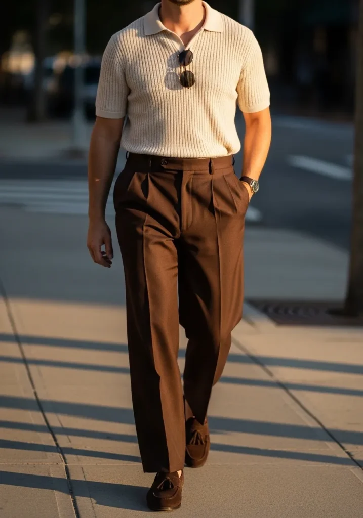 This outfit feels like effortless European summer style. He is wearing high waisted brown pleated trousers with a relaxed wide leg that moves beautifully as he walks. The fabric has a soft sheen that catches the light and highlights the clean tailoring. On top, a fitted cream ribbed knit polo adds texture and warmth without overpowering the look. Brown suede loafers keep the palette rich and cohesive, and the sunglasses tucked at the neckline add that subtle styled touch. The whole vibe is refined, masculine, and quietly luxurious.