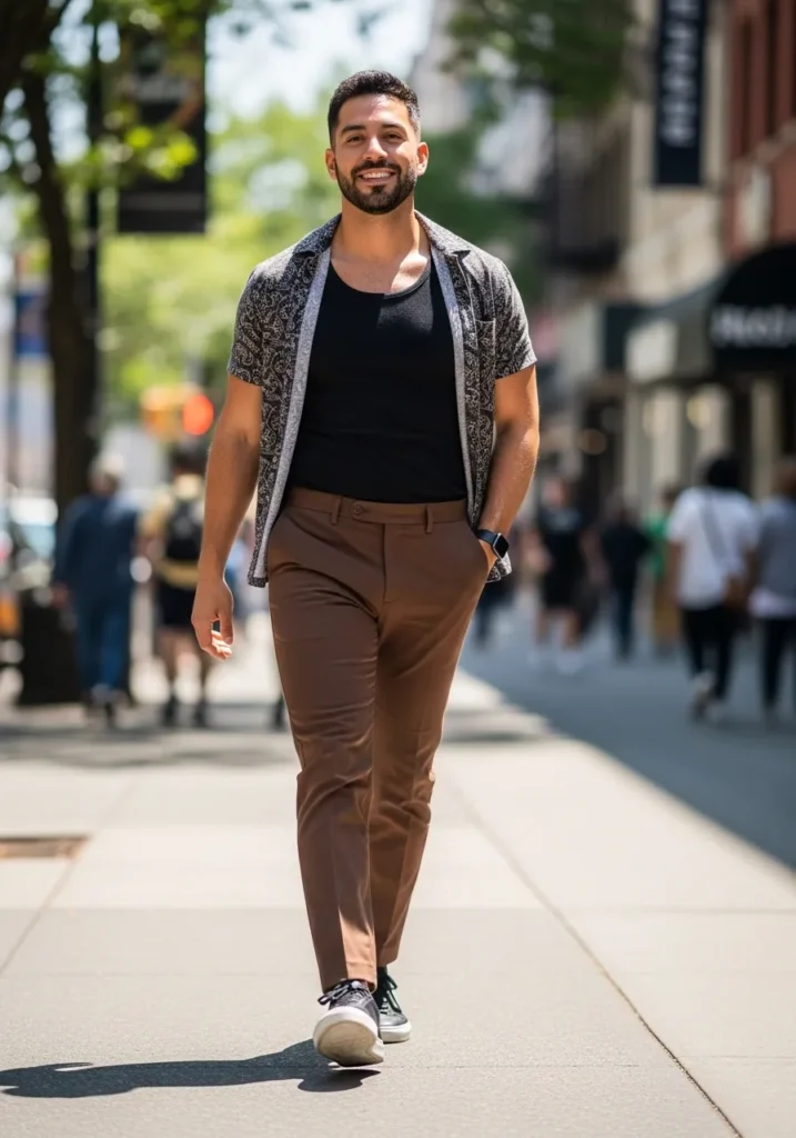 This look is giving confident city energy in the best way. He is wearing slim tailored brown trousers that sit clean at the waist and taper slightly through the leg. The fabric looks smooth and structured, which keeps the silhouette sharp. On top, a fitted black tank adds a sleek base layer, while the short sleeve patterned shirt worn open brings texture and personality. Casual sneakers finish the outfit with a relaxed twist. The whole vibe feels modern, bold, and very street style ready.