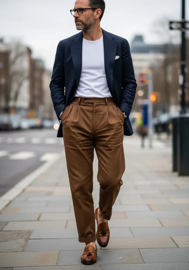 I love this combination because it mixes classic pieces in a fresh way. The brown trousers feel rich and tailored, while the simple T shirt keeps it from feeling too formal. If you are into elevated outfits that still look wearable for real life, this is such a strong example. To me, it feels like effortless grown man style with a modern twist. It is sophisticated without being stiff, and that balance makes it absolutely worth saving.