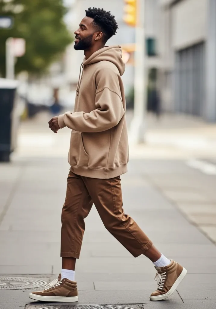This look feels cool and effortless with a modern street twist. He is wearing cropped brown trousers that hit just above the ankle, giving the outfit a fresh and slightly playful proportion. The pants have a clean tailored cut, which contrasts nicely with the relaxed oversized hoodie in a soft neutral beige tone. White crew socks and tan high top sneakers add a sporty edge and keep the color palette cohesive. The overall vibe is casual, contemporary, and very fashion aware without trying too hard.