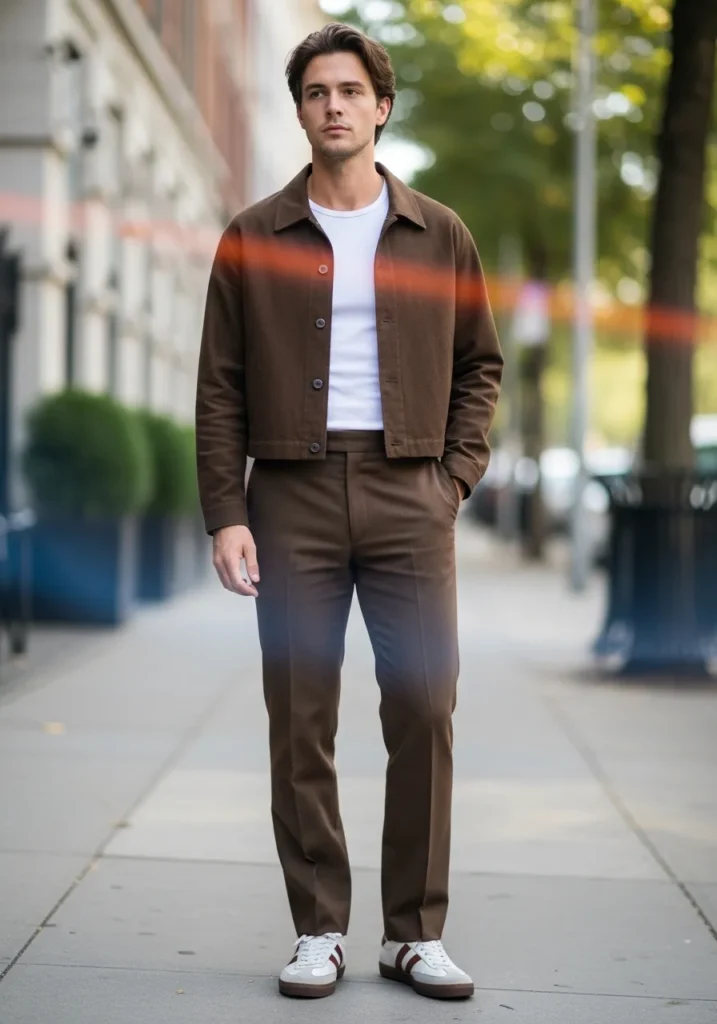 This outfit is such a masterclass in tonal dressing. He is wearing tailored brown trousers with a straight leg that falls neatly over classic white sneakers. The fabric looks smooth and structured, giving the pants a sharp silhouette. On top, a crisp white T shirt keeps things fresh and minimal, layered under a cropped brown jacket in a slightly deeper shade. The matching brown tones create a cohesive look that feels intentional and elevated. The overall vibe is modern, streamlined, and quietly confident.