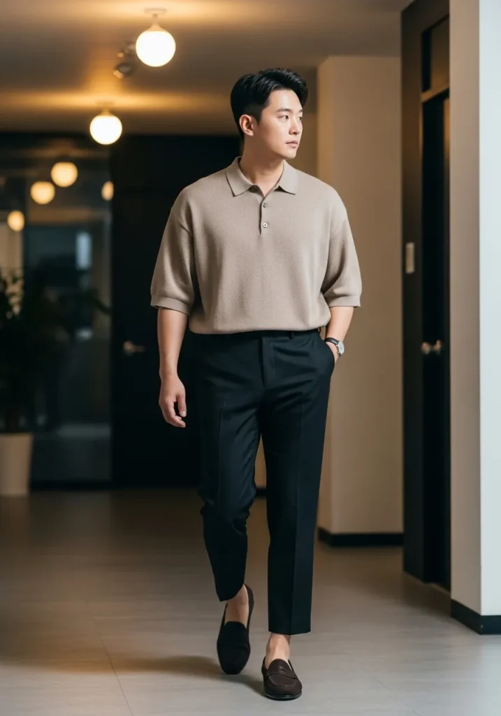 This outfit pairs a soft beige short sleeve polo with clean black tailored trousers and dark loafers. The fabric looks lightweight and slightly structured, which keeps the polo from feeling too casual. Everything fits neatly without being tight, giving off that effortless Gen Z office vibe that feels modern and calm.