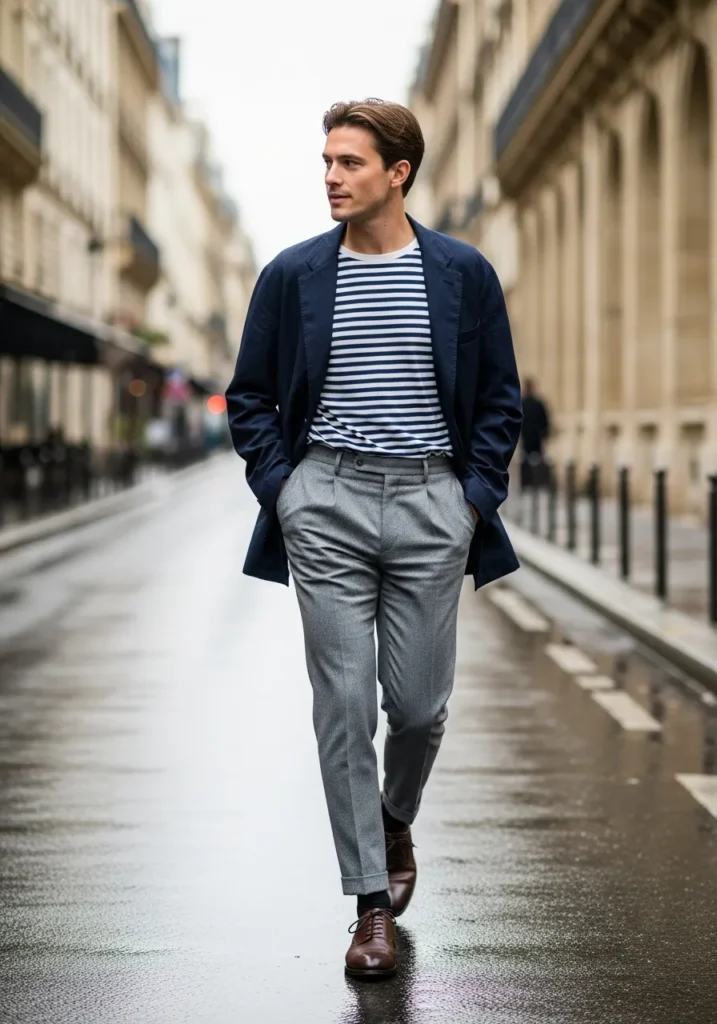 This look features a navy jacket layered over a striped t shirt, paired with gray trousers and brown shoes. The stripes add visual interest, while the jacket keeps things sharp. The fit feels tailored but comfortable.