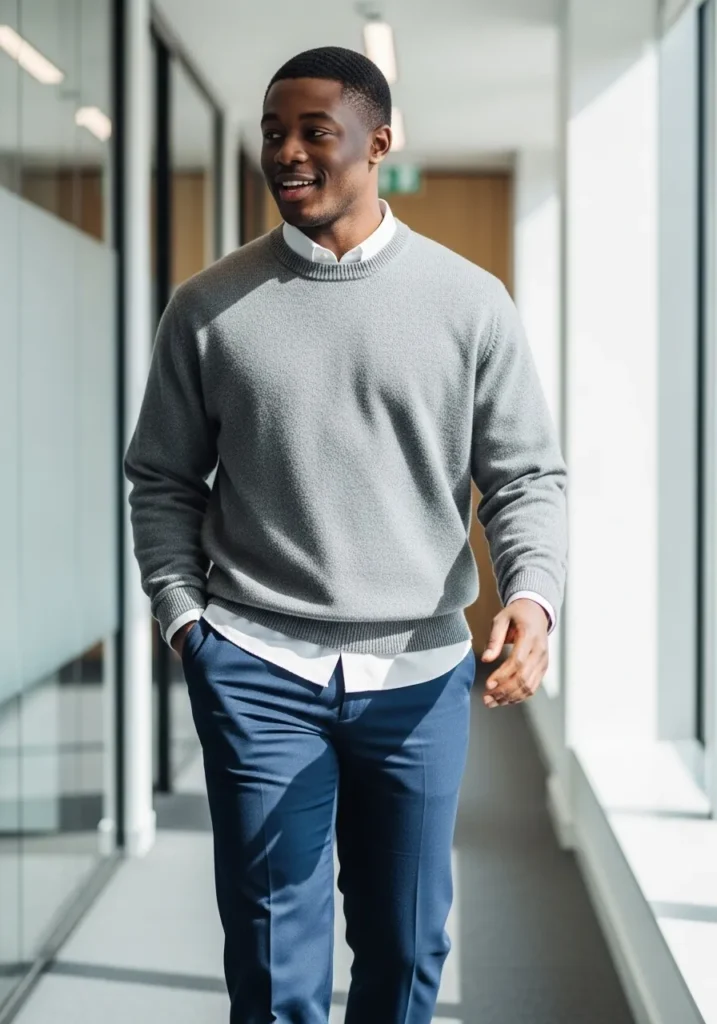 This outfit shows a light gray sweater layered over a white button down, paired with dark blue trousers. The layering adds depth, while the colors stay soft and professional. Everything looks comfortable and clean.