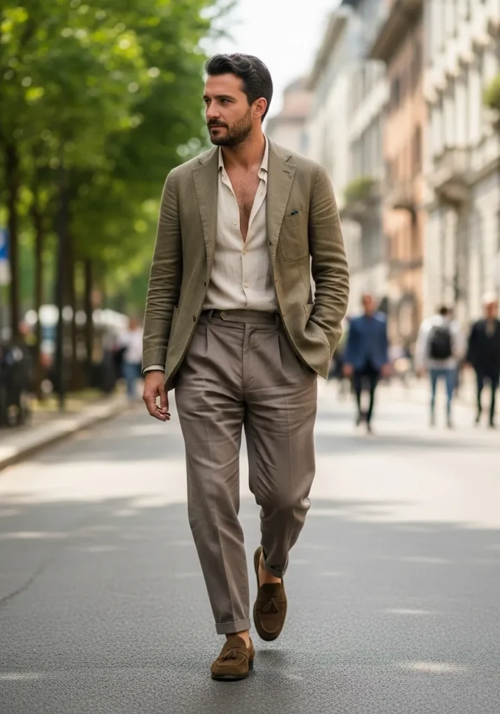 This look centers around an olive green suit paired with a dark top and polished black shoes. The tailoring is slim but not tight, and the earthy tone makes the suit feel fresh and wearable. It feels more street inspired than corporate.