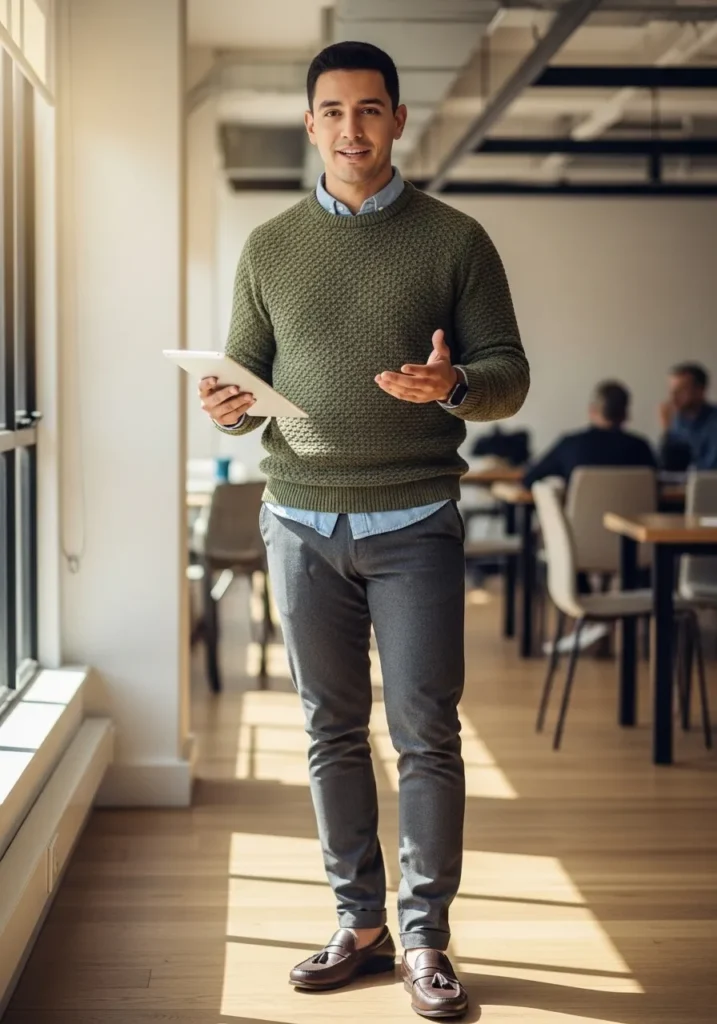 This look features a deep green knit sweater layered over a crisp button down, paired with slim gray trousers and classic leather shoes. The sweater has a soft texture that instantly makes the outfit feel cozy, while the shirt peeking out keeps it professional.