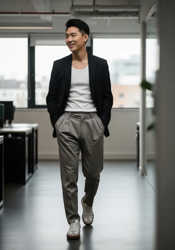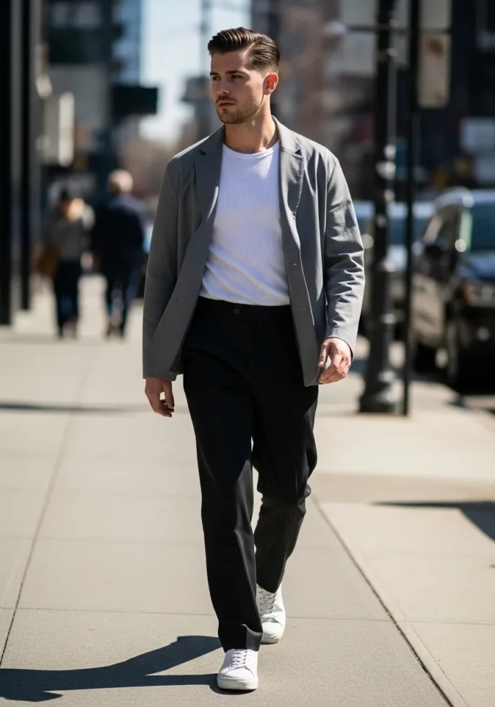 This outfit pairs a light gray blazer with a white t shirt, black trousers, and casual sneakers. The blazer adds structure, while the tee keeps the vibe relaxed and current. The neutral colors make everything feel clean and balanced.