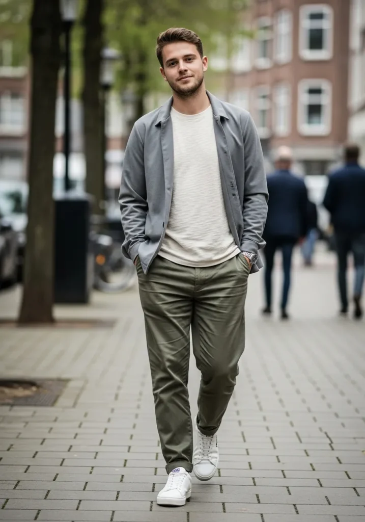 Here we see a light gray jacket styled with a soft neutral top and olive green trousers. The pants add color while still feeling subtle, and the sneakers keep the outfit casual and wearable. Everything fits neatly without feeling tight.