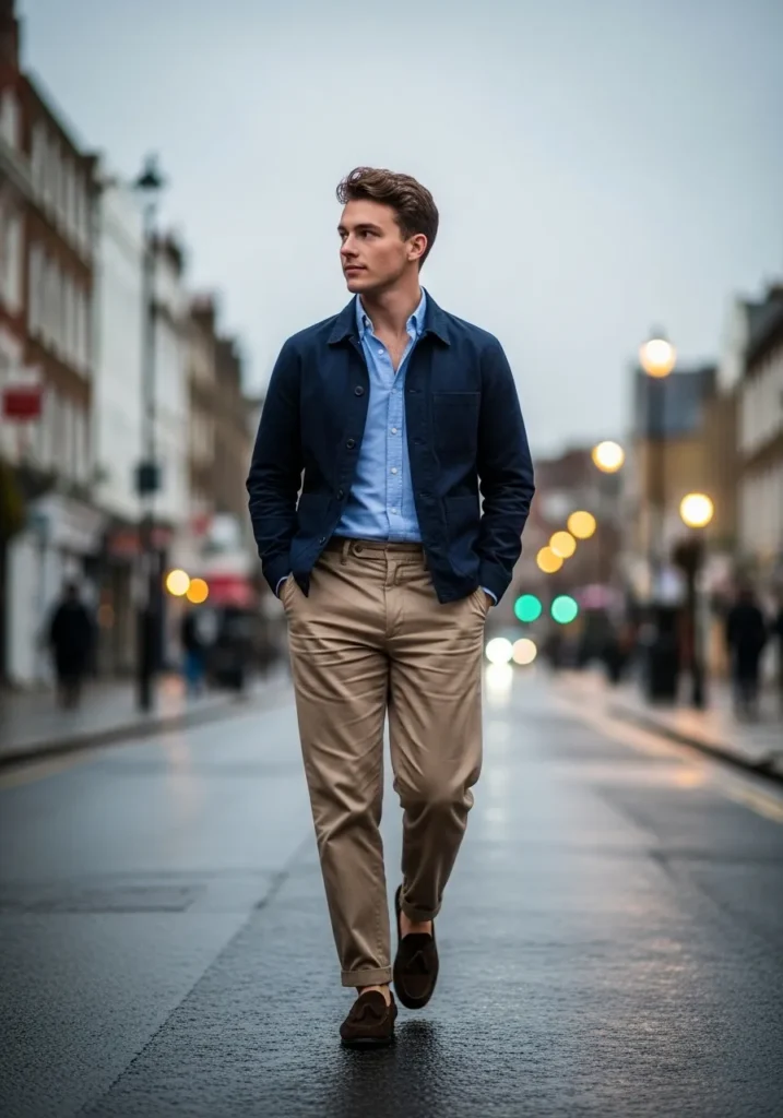This look features a navy blazer layered over a light blue shirt, paired with slim khaki trousers and brown shoes. The blazer adds structure, while the open shirt keeps things casual and approachable. The color combo feels classic but styled in a very current way.