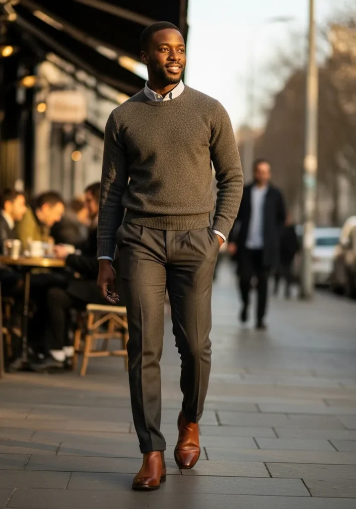 Here we see a fitted charcoal crew neck sweater styled with dark tailored trousers and brown leather shoes. The sweater looks soft and cozy, while the pants keep the outfit grounded in business casual territory. The overall palette stays neutral and refined.