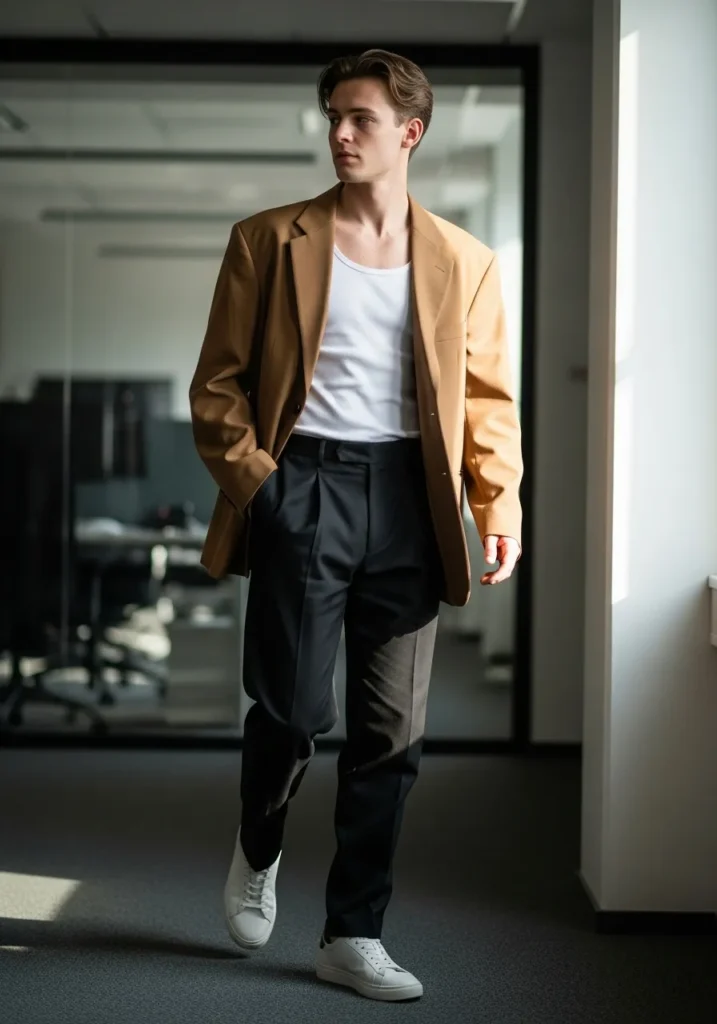 This outfit combines a camel blazer with a crisp white t shirt, dark trousers, and clean white sneakers. The blazer brings structure, while the t shirt and sneakers make it feel modern and youthful. The fit is relaxed but intentional.