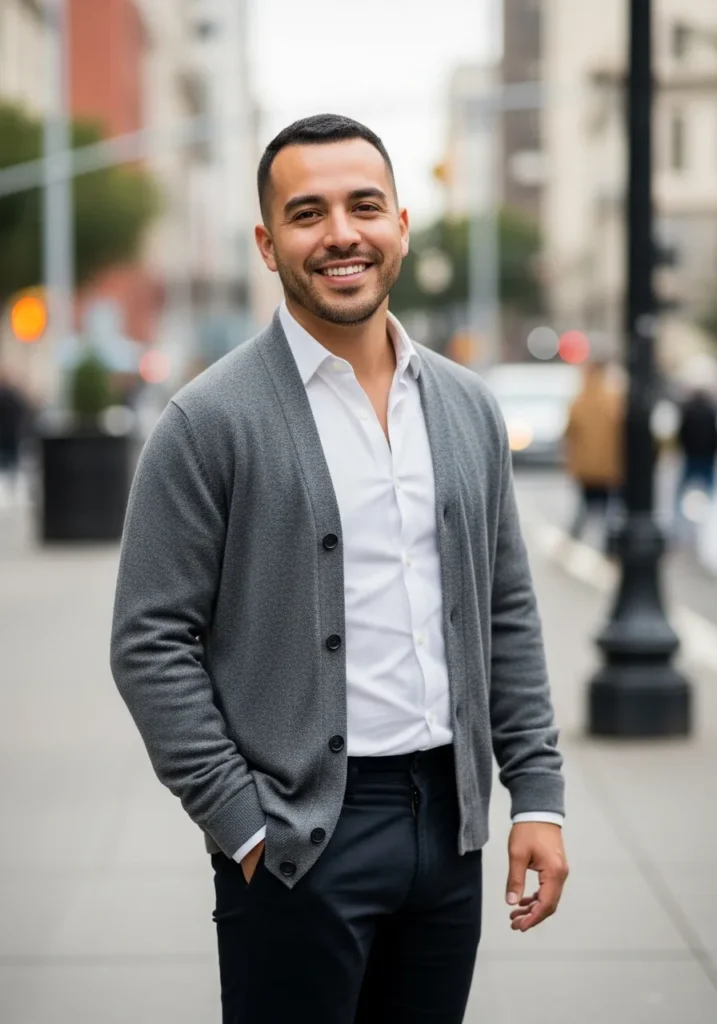 This look features a light gray cardigan layered over a white button down shirt, paired with dark trousers. The cardigan adds texture and softness, while the shirt keeps it office appropriate. Everything looks comfortable but still neat.