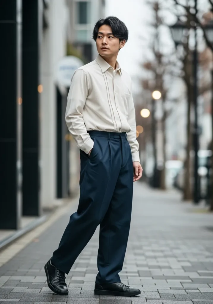 This outfit pairs a cream button up shirt with dark wide leg trousers and black shoes. The shirt looks slightly relaxed, while the trousers add structure and a modern silhouette. The overall look feels clean and thoughtfully styled.