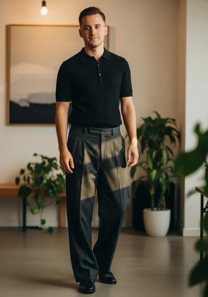 This outfit features a black short sleeve polo tucked into charcoal tailored trousers, finished with dark leather shoes. The clean lines and fitted silhouette keep everything sharp, while the polo fabric softens the overall feel. It is minimal, modern, and very intentional.