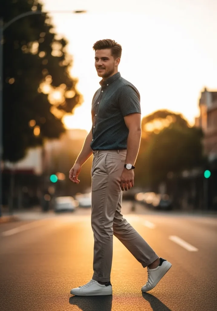 Here we have a fitted dark t shirt paired with light khaki pants and clean sneakers. The pants are tailored enough to keep it office friendly, while the t shirt keeps things relaxed and youthful. The whole look feels easy and natural.