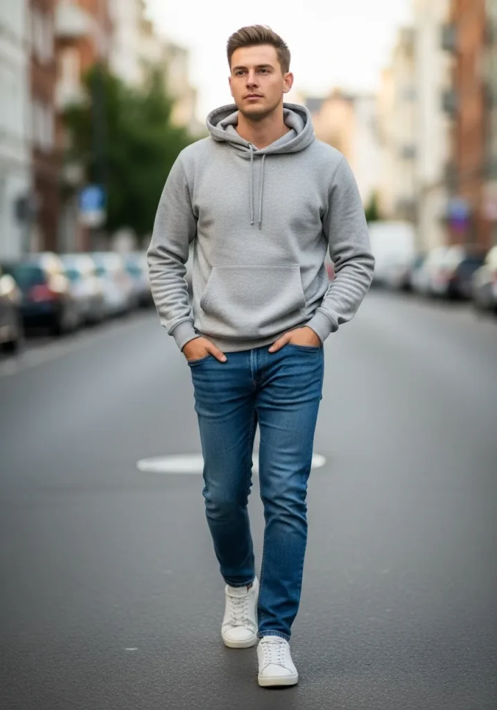 This look features a soft gray hoodie paired with classic blue jeans and clean white sneakers, creating an effortlessly relaxed street-style vibe that feels modern and approachable. The slightly tapered jeans and minimal color palette keep everything looking fresh, while the hoodie adds that cozy, laid-back touch that works for everyday wear.