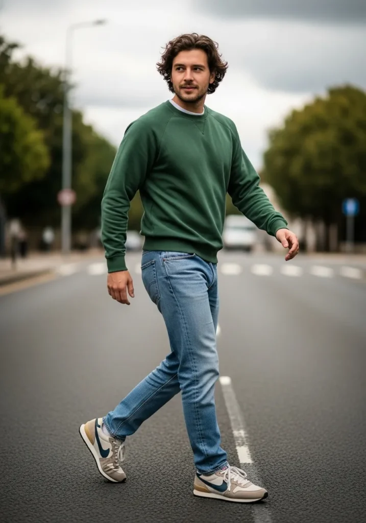 A forest green sweater paired with relaxed blue jeans and neutral sneakers creates a sporty yet casual everyday outfit. The fresh color adds personality while keeping the overall look wearable and easy.