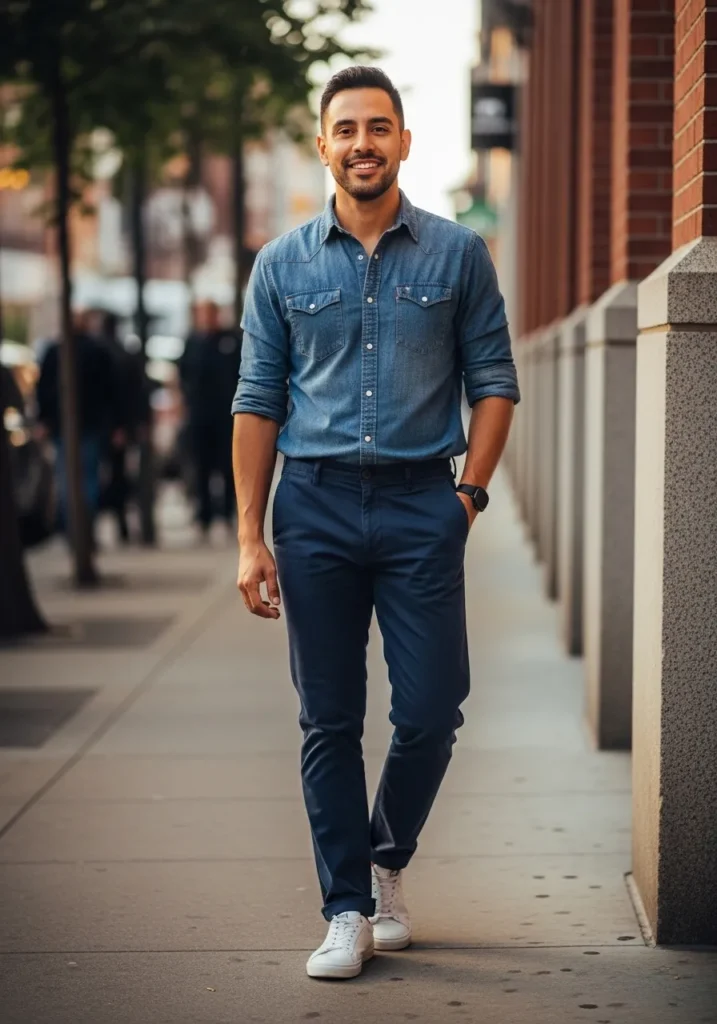 A chambray button-down paired with slim navy trousers and white sneakers creates a smart casual outfit that feels polished but relaxed. The soft denim texture keeps the look approachable and modern.