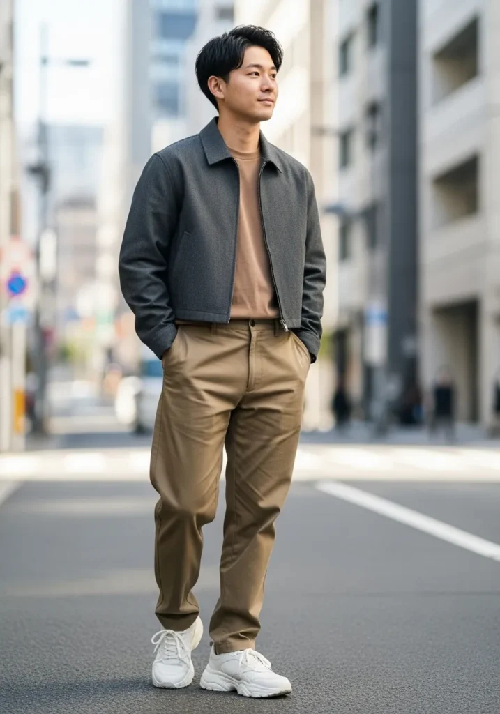 A dark lightweight jacket layered over a beige shirt and khaki trousers creates a balanced and modern casual look. The neutral palette and clean sneakers keep everything looking fresh and wearable.