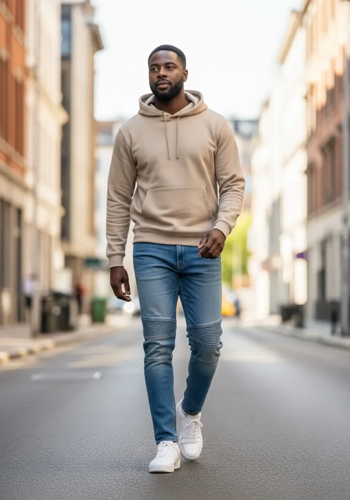 A soft beige hoodie paired with slim blue jeans and fresh white sneakers creates an easygoing street-style outfit that feels relaxed yet polished. The neutral tones keep the look clean and modern, while the casual fit makes it perfect for daily wear without sacrificing style.