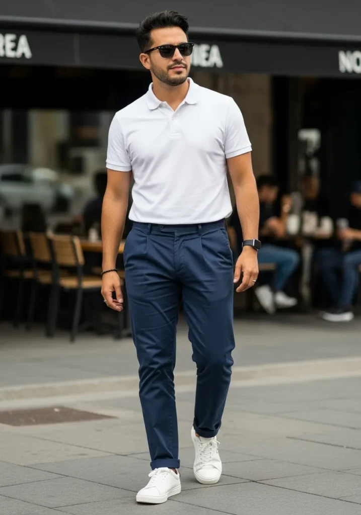 A clean white polo shirt styled with tailored navy trousers and white sneakers creates a polished casual look that feels fresh and modern. The sharp fit and simple color palette give this outfit a refined edge while keeping it relaxed and approachable.