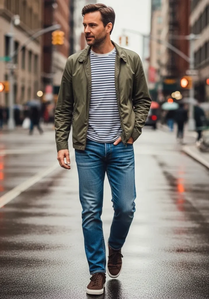 An olive green jacket layered over a striped T-shirt and classic blue jeans creates a stylish city-ready outfit that feels both relaxed and put together. The layered textures and subtle contrast keep the look interesting while staying timeless.