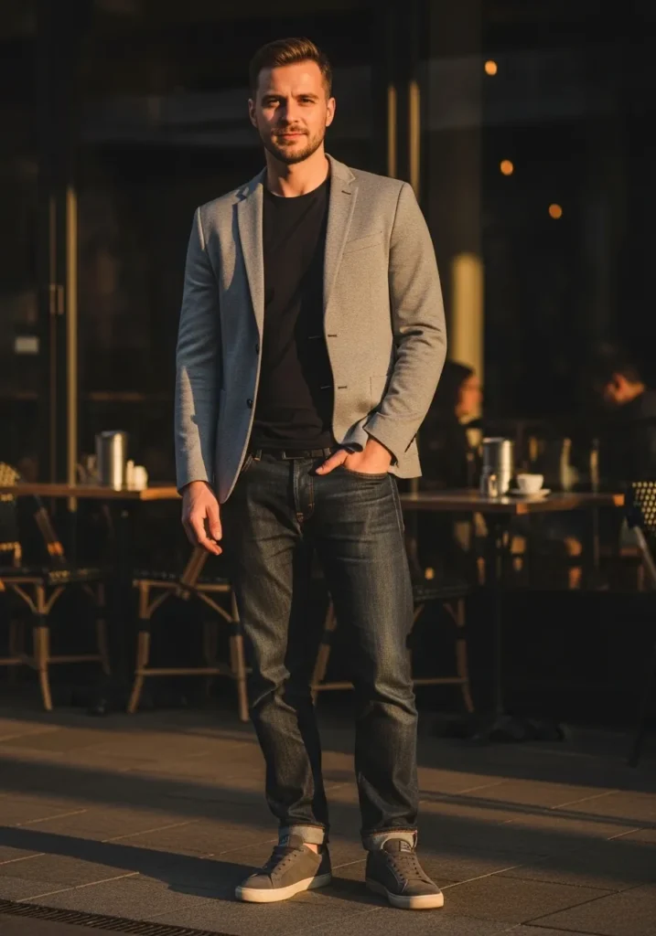 A soft gray blazer layered over a casual T-shirt and dark jeans creates a cozy yet polished outfit perfect for evenings out. The darker tones and structured layers give the look depth while keeping it relaxed and approachable.