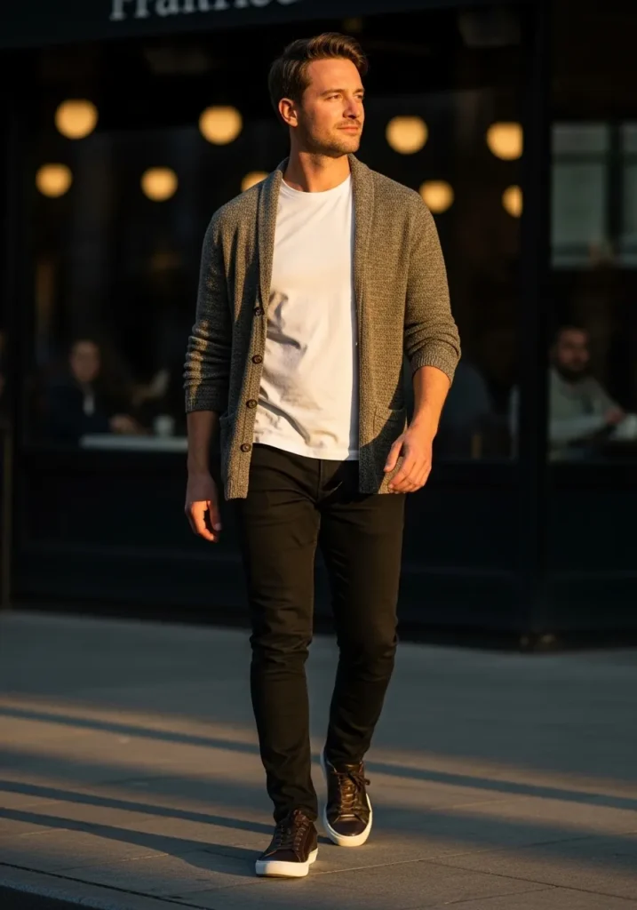 A lightweight cardigan layered over a casual graphic T-shirt and slim black jeans creates a laid-back outfit with a modern twist. The soft textures and neutral tones give this look an effortlessly stylish finish.