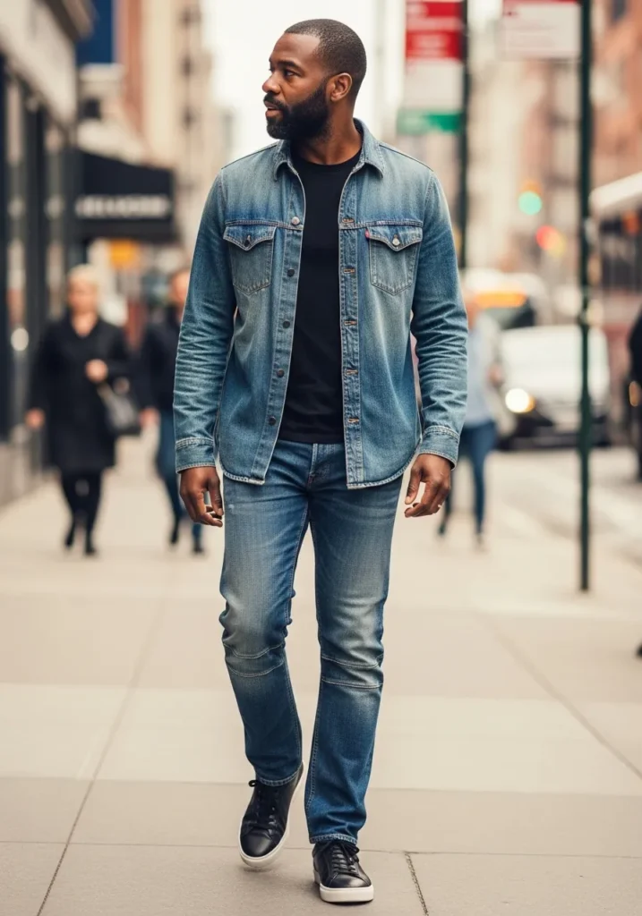 A timeless denim jacket paired with a neutral tee and dark jeans creates a clean, casual outfit that never goes out of style. The simple layering and classic colors make this look endlessly wearable and versatile.