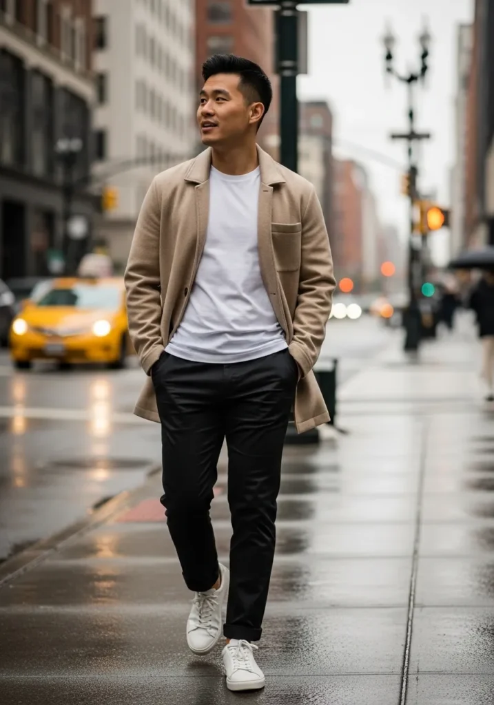 A light beige jacket layered over a crisp white T-shirt and black slim-fit pants creates a sharp, city-ready outfit that balances casual and polished perfectly. The clean sneakers keep the look grounded and wearable, while the neutral tones make it endlessly versatile and stylish.