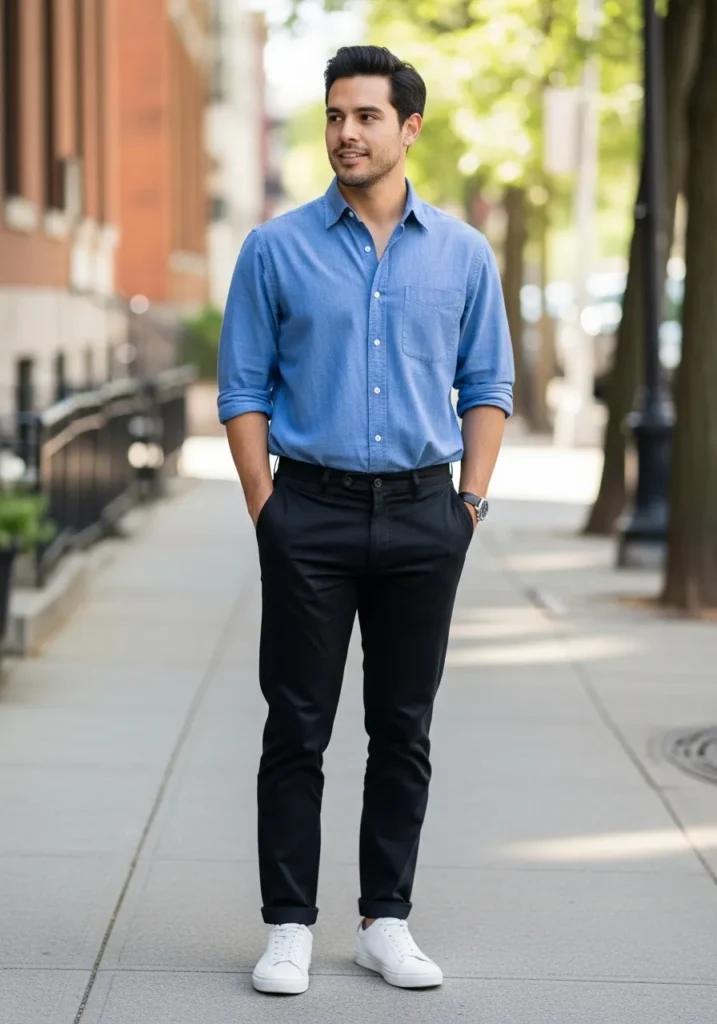 A light blue button-down styled with slim black trousers and white sneakers creates a crisp, modern casual outfit that feels clean and sharp. The simple color palette and tailored fit keep the look effortlessly polished.