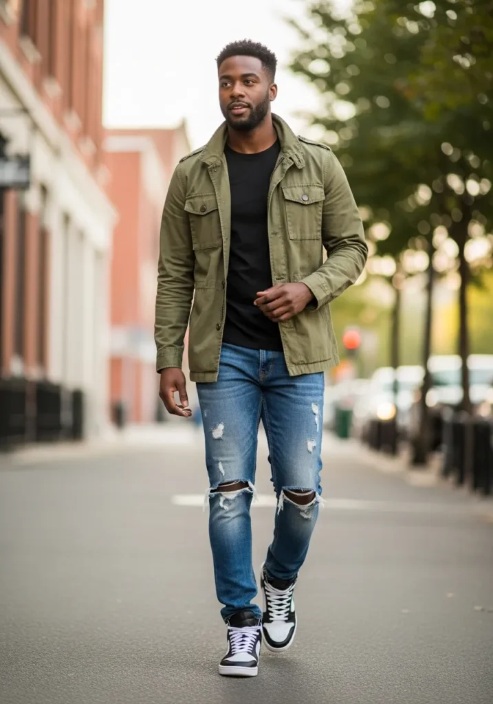 An olive green utility jacket paired with a dark tee, distressed blue jeans, and sporty sneakers creates a rugged yet relaxed everyday look. The layers add depth and texture, while the muted color palette keeps everything looking modern and wearable.