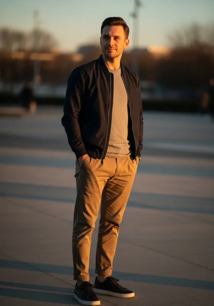 A sleek dark jacket layered over a simple shirt and tan chinos creates a polished yet relaxed outfit that feels ideal for evening strolls or casual dinners. The warm neutral tones and clean sneakers keep the look sharp while staying comfortable.