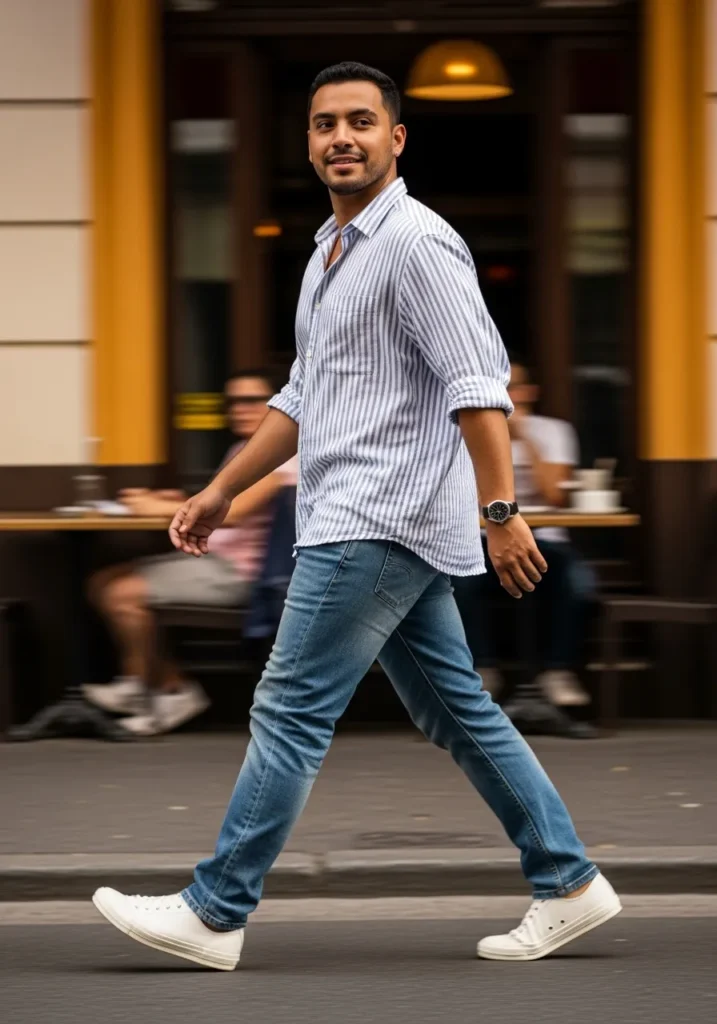 A light striped button-down shirt worn with relaxed blue jeans and crisp white sneakers creates a fresh and approachable everyday outfit. The rolled sleeves add an effortless touch that keeps everything looking casual and relaxed.