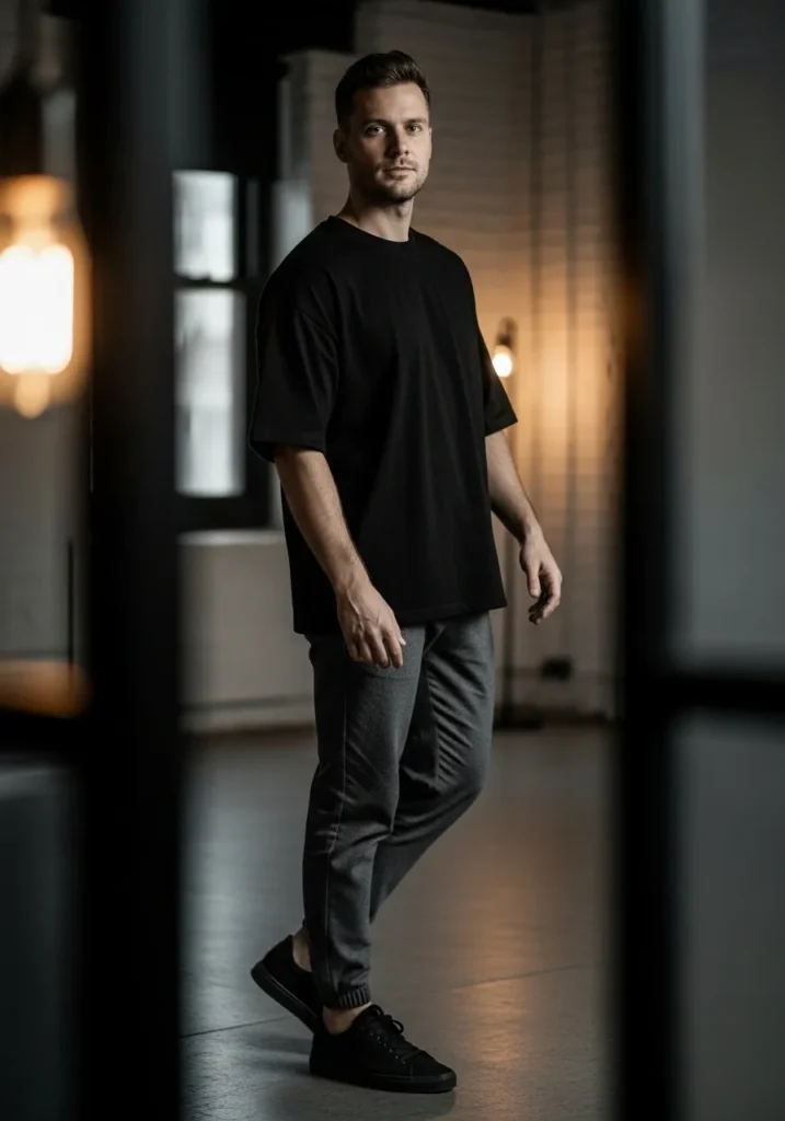 A black relaxed-fit top paired with charcoal trousers and dark sneakers creates a sleek, modern casual outfit with a minimal aesthetic. The clean lines and simple color palette keep the look sharp and refined.