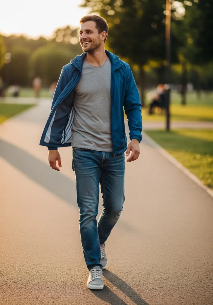 A lightweight blue jacket layered over a neutral T-shirt and classic denim jeans creates an easygoing outfit perfect for relaxed weekends. The casual sneakers add comfort while keeping the look stylish and fresh.