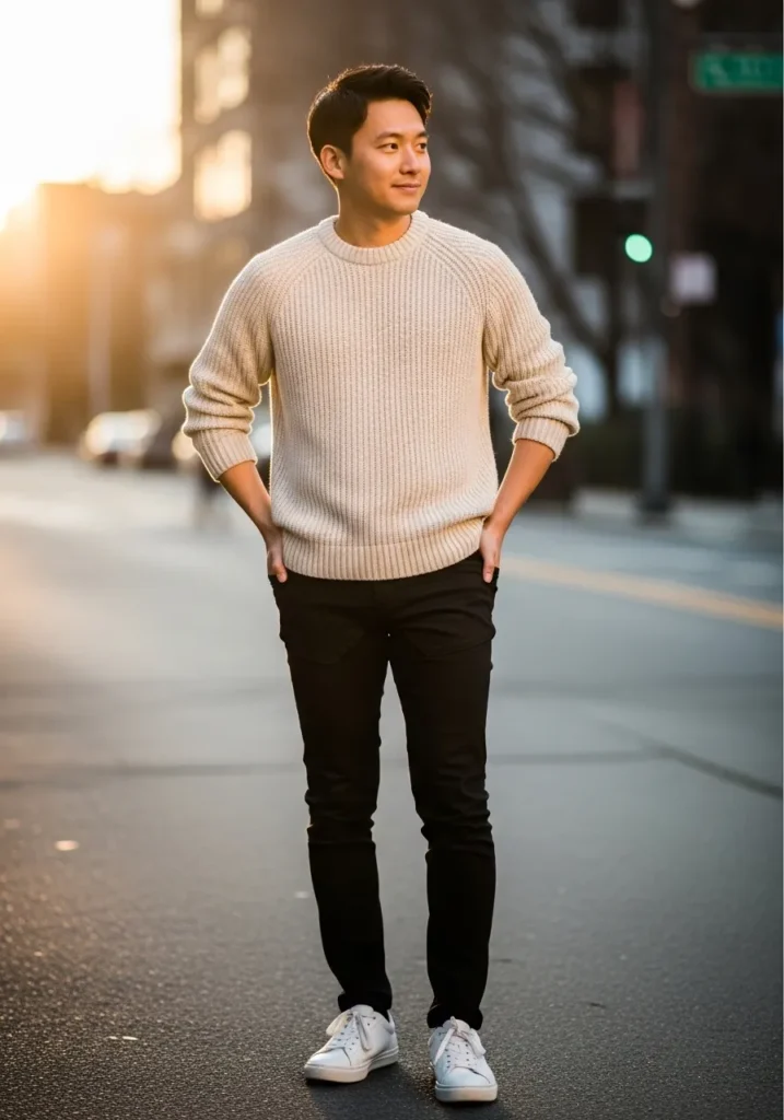 A soft cream knit sweater paired with black slim-fit jeans and white sneakers creates a clean and cozy casual look. The soft textures and warm tones give the outfit a relaxed yet polished vibe.