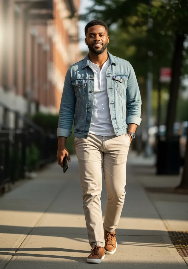 A light denim jacket layered over a neutral shirt and beige trousers creates a timeless casual outfit that feels fresh and modern. The mix of textures keeps everything interesting while staying easy to wear.