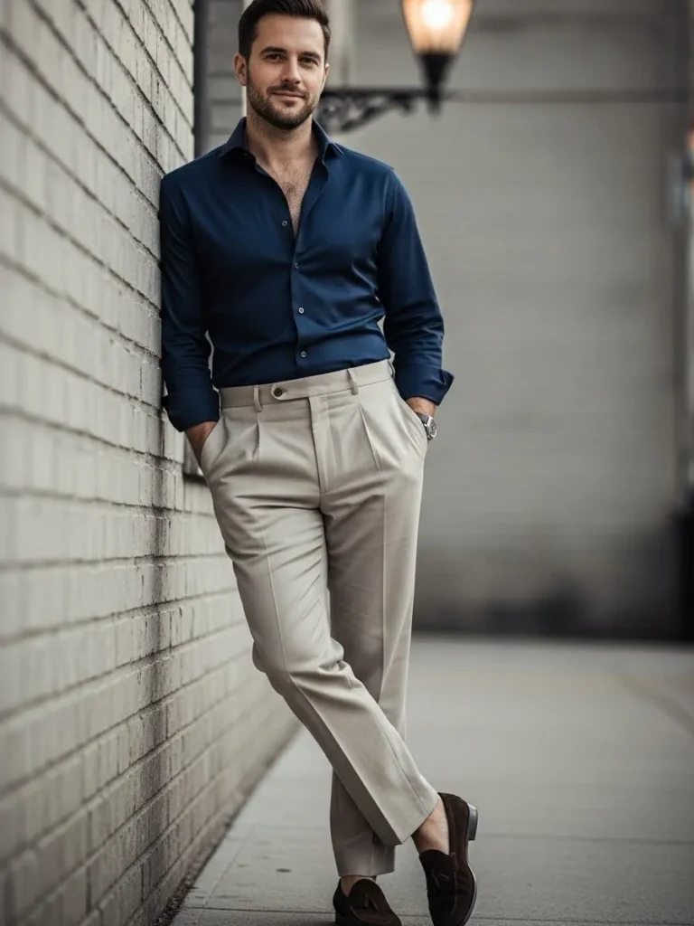This outfit pairs a deep navy button up shirt with light beige tailored trousers and clean brown shoes.
