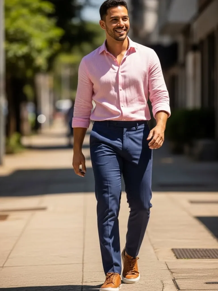 A soft pink shirt is paired with navy trousers and warm brown shoes for a fresh semi formal look.