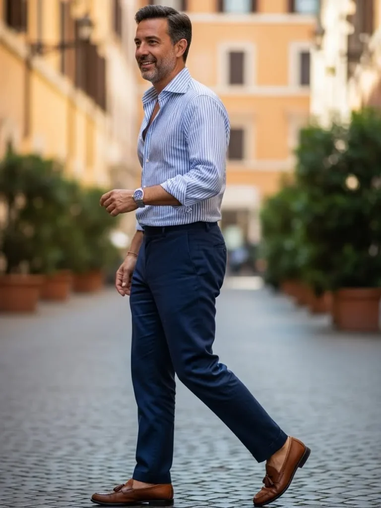 This outfit combines a light blue shirt with navy trousers and classic leather shoes.